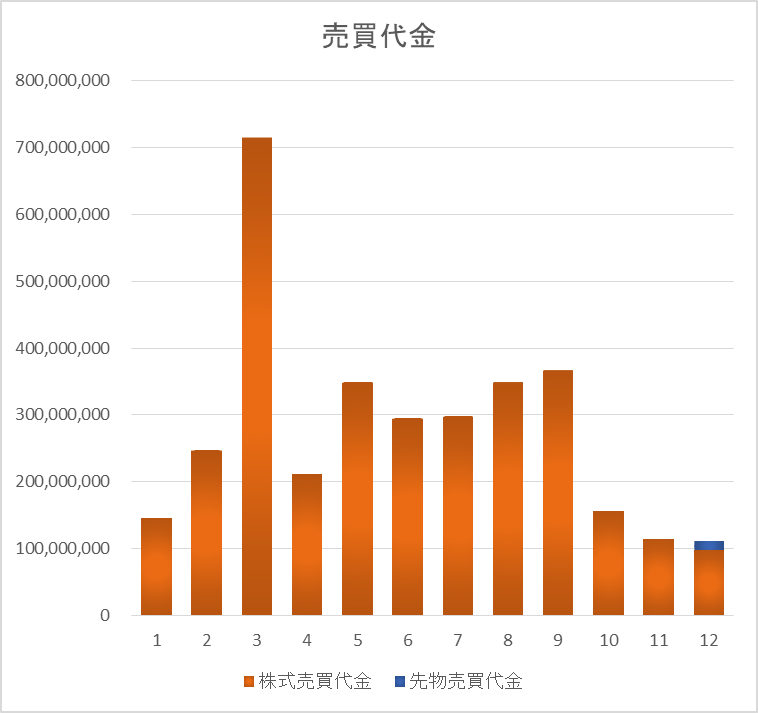 今月は売買代金が約1.1億。今年最少でした。先物をかなり久しぶりに触って敗戦。。